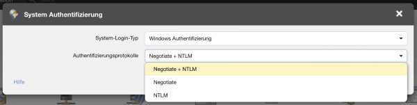 In der Konfiguration kann das intern verwendete Authentifizierungsprotokoll ausgewählt werden. Wenn Sie eines auswählen, das Negotiate enthält, wird der Kerberos-Authentifizierungsmechanismus verwendet.