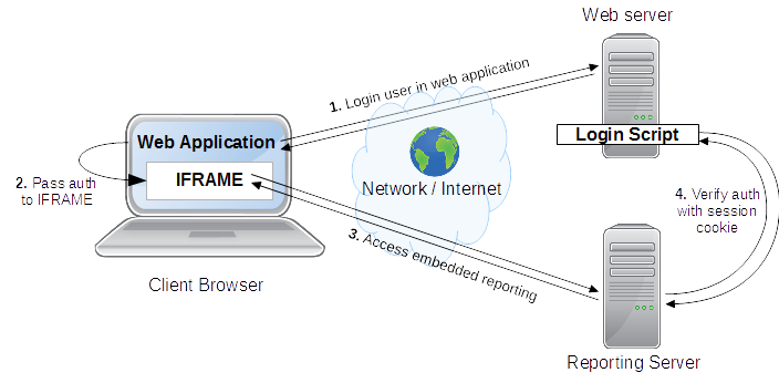 As you can see, the most critical point here is to pass the session from your web application to the reporting IFRAME. Most browsers will try to prevent you from re-using a cookie for another host. So it requires sophisticated JavaScript knowledge to implement such solution.