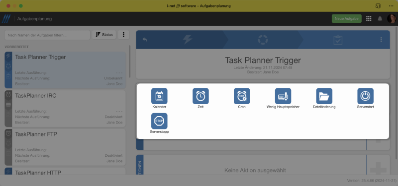 Ein Trigger ist ein Ereignis, das eine Aufgabe startet. Das System enthält standardmäßig einen Zeit-Trigger sowie einen Datei-Änderungs-Trigger vorinstalliert.