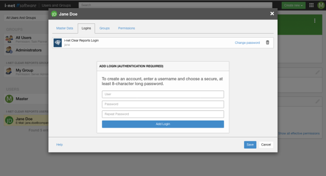 A user account can have one or more logins, depending on the available Login Providers. Users with the Manage Users and Groups permission can add additional logins to other user accounts. Users without this permission can only add additional logins to their own account.