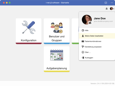 Zusätzlich zu diesen Bereichen gibt es eine Suchleiste und eine Aktionsschaltfläche zum Anlegen neuer Benutzer oder Gruppen. Das Anlegen neuer Benutzer und Gruppen ist immer über die Anwendung Benutzer und Gruppen möglich, obwohl es für andere Bereiche von i-net CoWork durch die Einstellung Login-Konfiguration deaktiviert werden kann.
