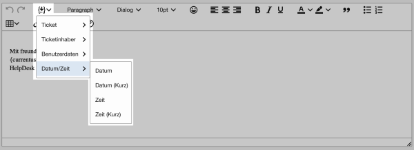 Platzhalter für Textbausteine können verwendet werden, um Werte aus dem Ticket in den Textbaustein zu übernehmen, wenn dieser in einen Bearbeitungsschritt eingefügt wird, z.B. als Signatur für eine E-Mail.