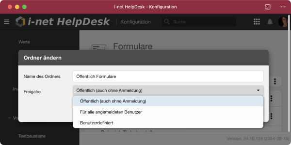Öffentlich (auch ohne Anmeldung): Jeder, der den Link zu einem Formular kennt, kann dieses anonym ausführen. Es besteht kein Zugriff auf die Auswahl eines Ticket-Besitzers. Öffentliche Formulare können z.B. für Feedback verwendet werden.