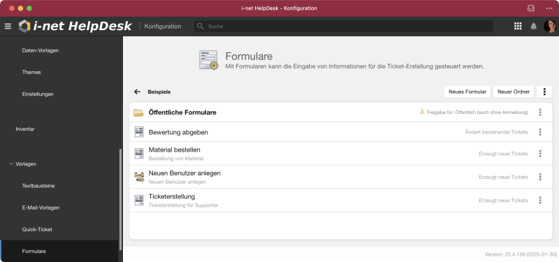 Mit Formularen kann das Erstellen von Tickets sowohl für Supporter als auch für Endanwender und sogar anonyme Benutzer stark vereinfacht werden. Mit Hilfe von Formularen ist das Verwenden der Tickets Anwendung nicht zwingend notwendig und es kann genauer gesteuert werden, welche Informationen für ein neues Ticket tatsächlich benötigt werden.