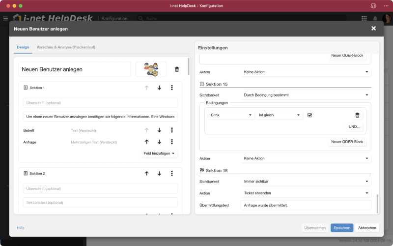 In Formularen können sowohl bestehende Ticket-Felder als auch neue, nur für dieses Formular gültige Felder angelegt und in das spätere Ticket übernommen werden. Formulare können in Sektionen definiert werden, die mit Bedingungen versehen, ein- und ausgeblendet werden können. Somit lässt sich z.B. ein komplexeres Frage-Antwort-Formular realisieren.