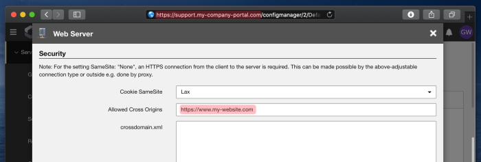 Note: The setting Allowed Cross Origin is an advanced setting. Here too, make sure that an https URL is used.