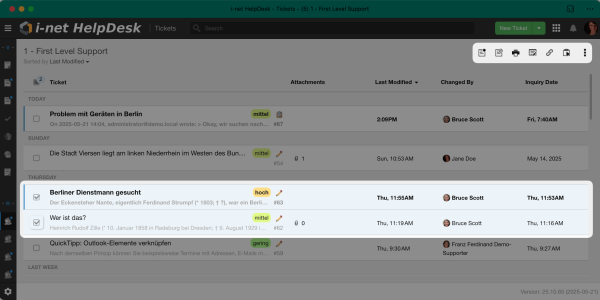 Note: The preview can be configured in the layout settings so that it is located next to or below the ticket list or entirely hidden. If the preview is hidden, tickets are opened directly by double-clicking in the ticket list.