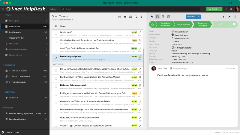 The application Tickets provides the central administration of inquiries and requests - in other words, tickets - from the i-net HelpDesk. Information on the individual tickets is displayed in a structured manner and processing of tickets is possible directly in this interface.