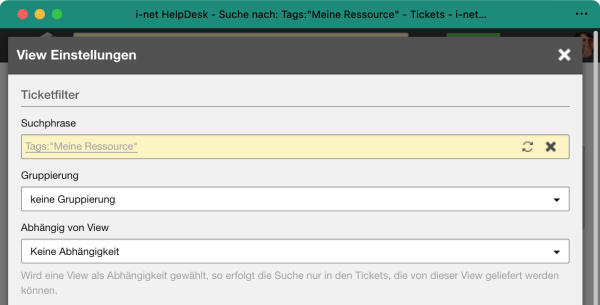 Beispiel: Ein Supporter mit überwachender Funktion hat Lese-Zugriff auf alle Tickets im System und ist zusätzlich explizit Mitglied in mehreren Ressourcen. In der View Offene Tickets hat der Supporter Zugriff auf alle offenen Tickets im System. Nun kann der Supporter sich eine weitere View Meine offenen Tickets mit oben stehender Suche anlegen. Darin wählt er als Abhängig von View die Offenen Tickets. Nun hat der Supporter eine View in der er nur Tickets sieht, für die er direkt verantwortlich ist.