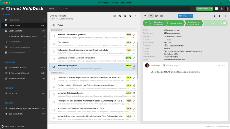Die Anwendung Tickets beinhaltet die zentrale Verwaltung von Anfragen und Aufträgen - sprich Tickets - des i-net HelpDesk. Es werden Informationen zu den einzelnen Tickets strukturiert dargestellt und eine konzentrierte Abarbeitung direkt in der gleichen Oberfläche ermöglicht.