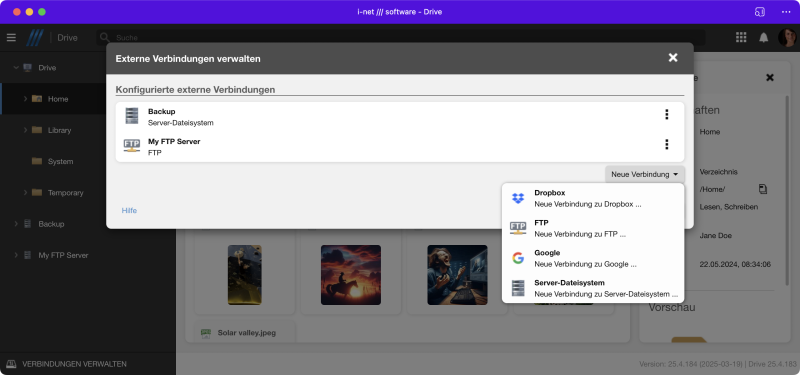 Benutzer mit der Berechtigung Serververwaltung haben Zugriff auf die Verbindung Server-Dateisystem, die es ermöglicht, einen Ordner auf dem Server in den Drive zu mounten. Auch hier können Links verwendet werden, um den Serverordner anderen Benutzern zur Verfügung zu stellen.
