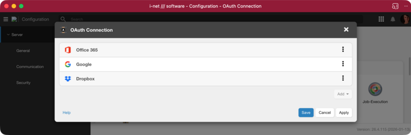 The OAuth Connection configuration allows to provide authenticated connections to Office 365 and Google services for fetching emails, calendars, and file storage access. Multiple connections can be defined and subsequently used in other dialogs of the configuration.
