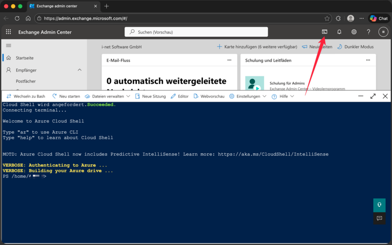 The pre-authentication now takes place in the Microsoft Exchange Admin Portal. You must be an organizational admin. Open the Cloud Shell using a PowerShell. This shell has all the Exchange Online tools preloaded.