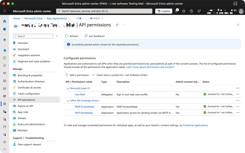 Note: All changes made in the Microsoft portals may take several tens of minutes to take effect and be correctly used by i-net PDFC.
