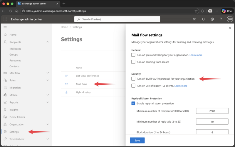 To complete this, you have to access Microsoft Exchange Admin Portal, navigate to Mail Flow and uncheck Turn off SMTP AUTH protocol for your organization.