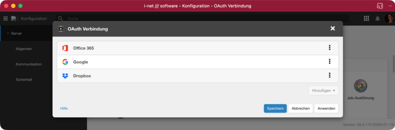 Die OAuth-Verbindung-Konfiguration ermöglicht die Bereitstellung authentifizierter Verbindungen zu Office 365 und Google-Diensten für den Abruf von E-Mails, Kalendern und Dateispeicherzugriff. Es können mehrere Verbindungen definiert und anschließend in anderen Dialogen der Konfiguration verwendet werden.