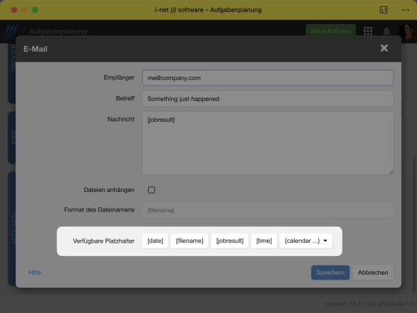 Die Platzhalter können in fast jedem Textfeld der Job- und Aktions-Konfiguration verwendet werden. Die Web-Oberfläche zeigt im unteren Bereich der Dialoge eine Liste der verfügbaren Platzhalter an.