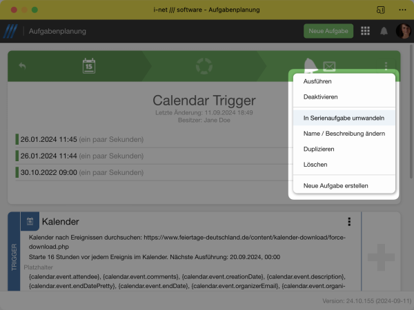 Um eine Aufgabe mehrmals mit verschiedenen Datensätzen auszuführen, kann diese in eine Serienaufgabe umgewandelt werden. Jobs und Aktionen werden einmal für jeden Datensatz aus der Seriendefinition ausgeführt.