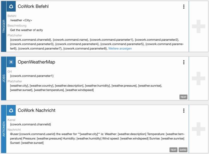 • OpenWeatherMap Job: der Platzhalter cowork.command.parameter wird als Standort für die Abfrage verwendet.