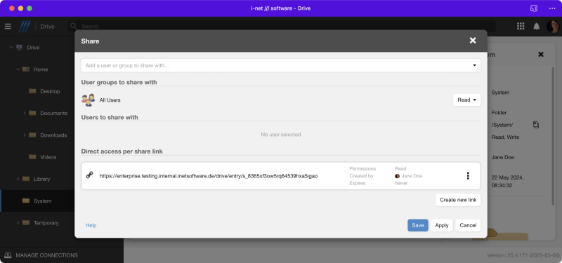 Sharing allows users to create direct access links to content on the Drive. It is an option to allow other users to access files and folders from a top-level Shared with me node in the application. When a folder is shared, all subfolders and files become available to a selected list of users or groups. Additionally or exclusively, a link can be created to the shared folder for global, anonymous access.