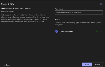 The configuration of incoming webhooks allows to have them re-used at various places and by the users. A web hook is created by a server administrator in Microsoft Teams.