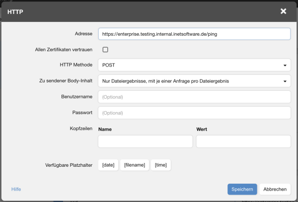 Die Aktion ruft die angegebene URL für jede Datei-Ergebnis-Variante auf1). Die Methoden für POST und PUT senden zusätzlich die Ergebnisdaten des File-Flavors.